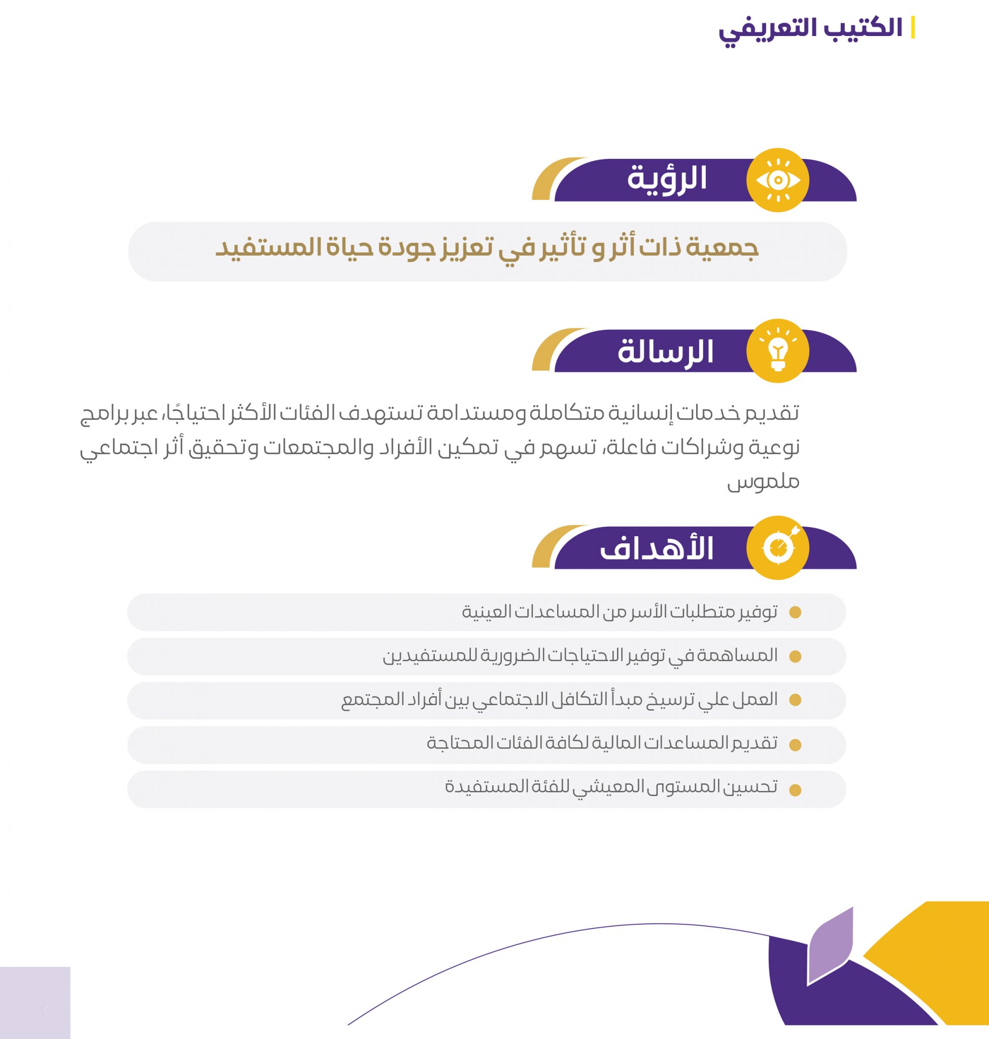 تقديم خدمات إنسانية متكاملة ومستدامة تستهدف الفئات الأكثر احتياجًا، عبر برامج نوعية وشراكات فاعلة، تسهم في تمكين الأفراد والمجتمعات وتحقيق اثر اجتماعي ملموس